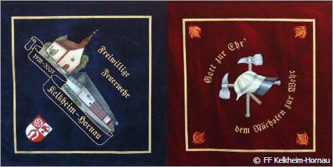 Zu einem solchen Traditionsverein gehört neben dem Namen auch ein äußeres Symbol zur Wiedererkennung. Dieses Symbol wurde im Jahr 2003 zum 75 jährigen Jubiläum durch die Frauen der Mitglieder der Einsatzabteilung in Form einer Vereinsfahne finanziert und realisiert. Die Frauen der Mitglieder der Einsatzabteilung veranstalteten hierzu eigene Flohmärkte und hatten Stände auf Weihnachtsmärkten, um die Finanzierung dieser Fahne zu ermöglichen, ohne die Vereinskasse zusätzlich zu belasten. Neben der Fahne ist ebenfalls ein Trageset bestehend aus Gurt, Helm und Hanschuhen angeschafft worden. Die Fahne repräsentiert somit die Freiwillige Feuerwehr Kelkheim-Hornau 1928 e.V. bei Umzügen, Festakten, Gedenkfeiern und Beerdigungen nach Außen. Die Fahne wird heute in einem eigens dafür angefertigten Fahnenschrank im Feuerwehrhaus zusammen mit einer Gedenktafel für die verstorbenen Mitglieder aufbewahrt. Wie unten abgebildet zeigt die Fahne auf der Vorderseite das Stadtwappen, das Feuerwehrhaus und die alte Hornauer Kapelle. Auf der Rückseite kreuzen sich 2 Äxte hinter einem Helm zusammen mit dem Wahlspruch der Feuerwehr "Gott zur Ehr, dem nächsten zur Wehr".